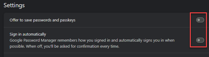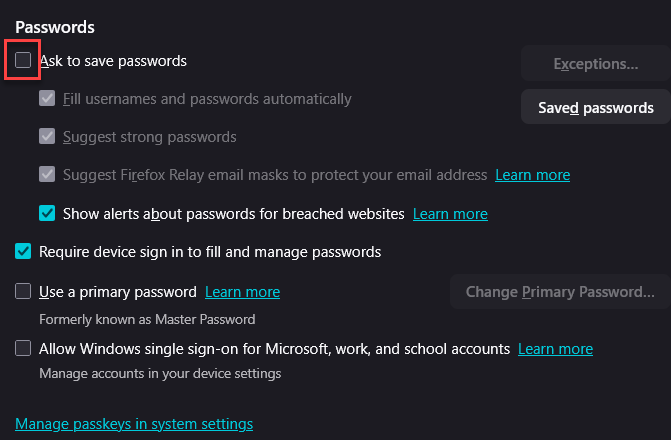 Recall how we recommended against default password managers like the web browser? Well, they won’t be happy and will still insist to be used. Here’s how to disable that in popular platforms