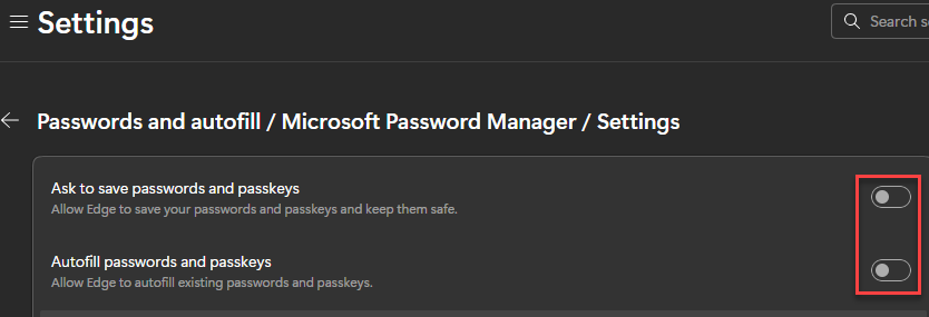 Microsoft Edge: Copy and paste the following into Edge edge://settings/autofill/passwords/settings and toggle off the pictured setting: